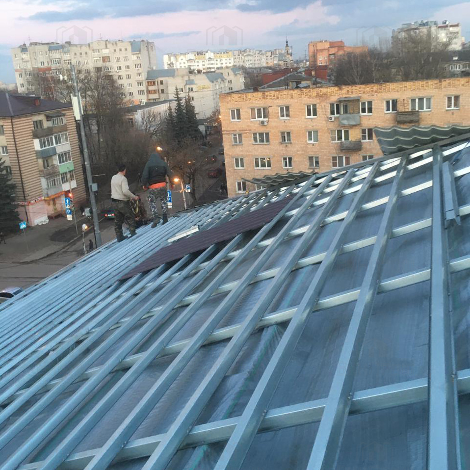 На фото полная замена кровли многоквартирного жилого дома. Максимальная длина пролета – 21 м. Общий вес металлоконструкций – 51 т. Марка стали: 350 класс цинкования – 275 г/м2.