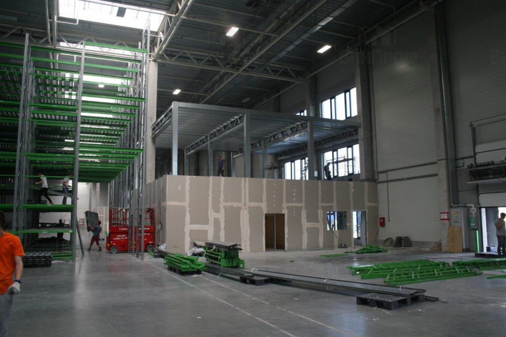 На фотографиях двухэтажная административная надстройка, выполненная из профиля-ЛСТК от компании "ВинПроф", в существующем складском помещении. Нижняя часть будет отдана для офисных нужд сотрудников логистического центра, а верхняя её часть будет использоваться для комфортного труда персонала.